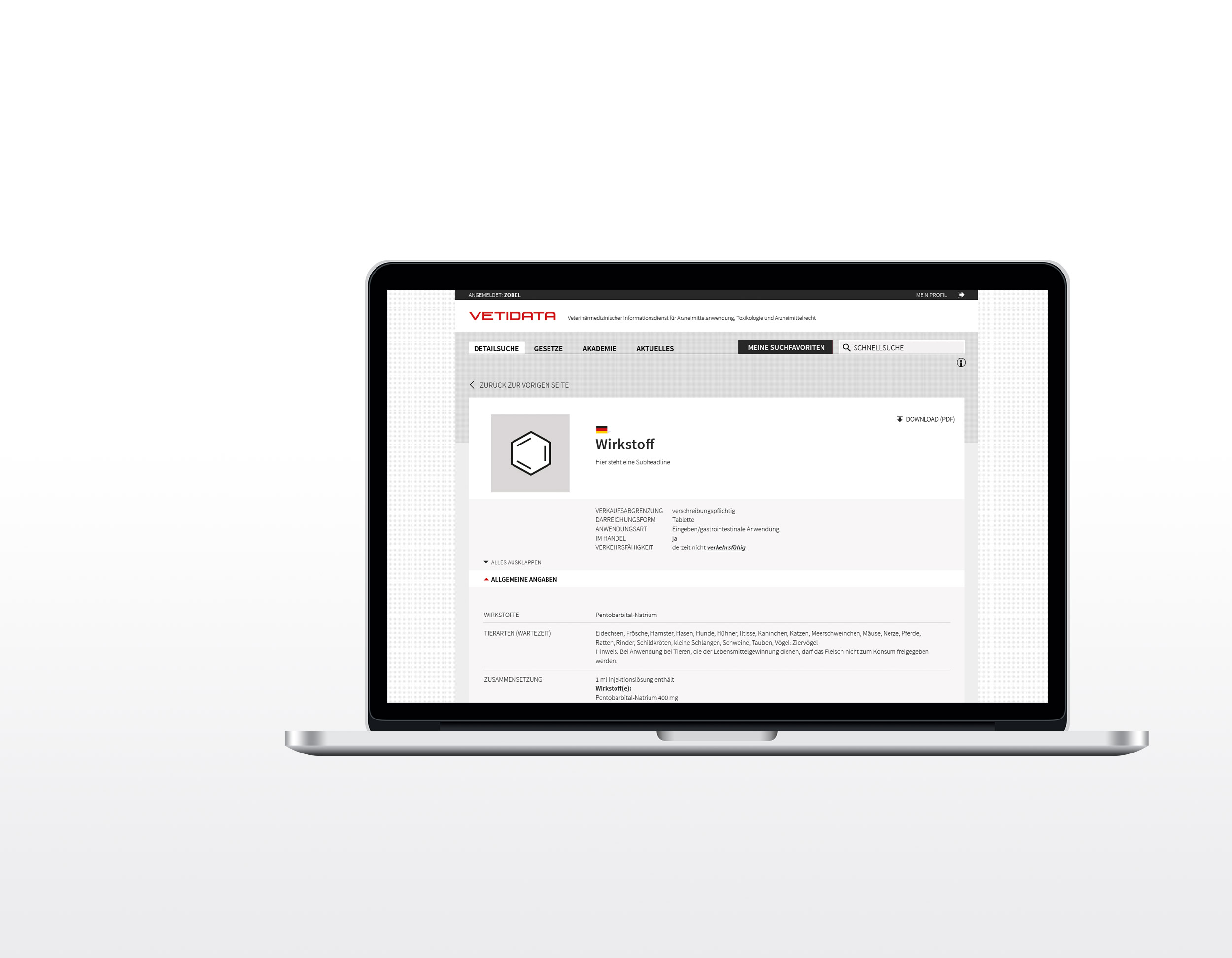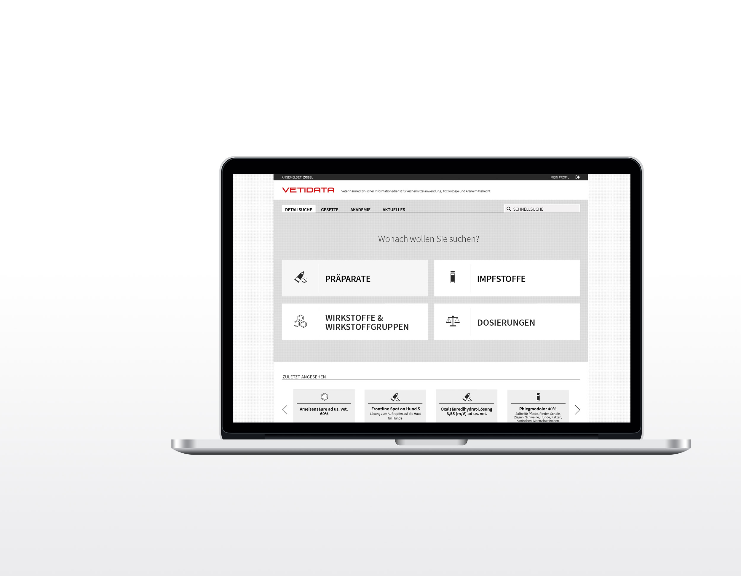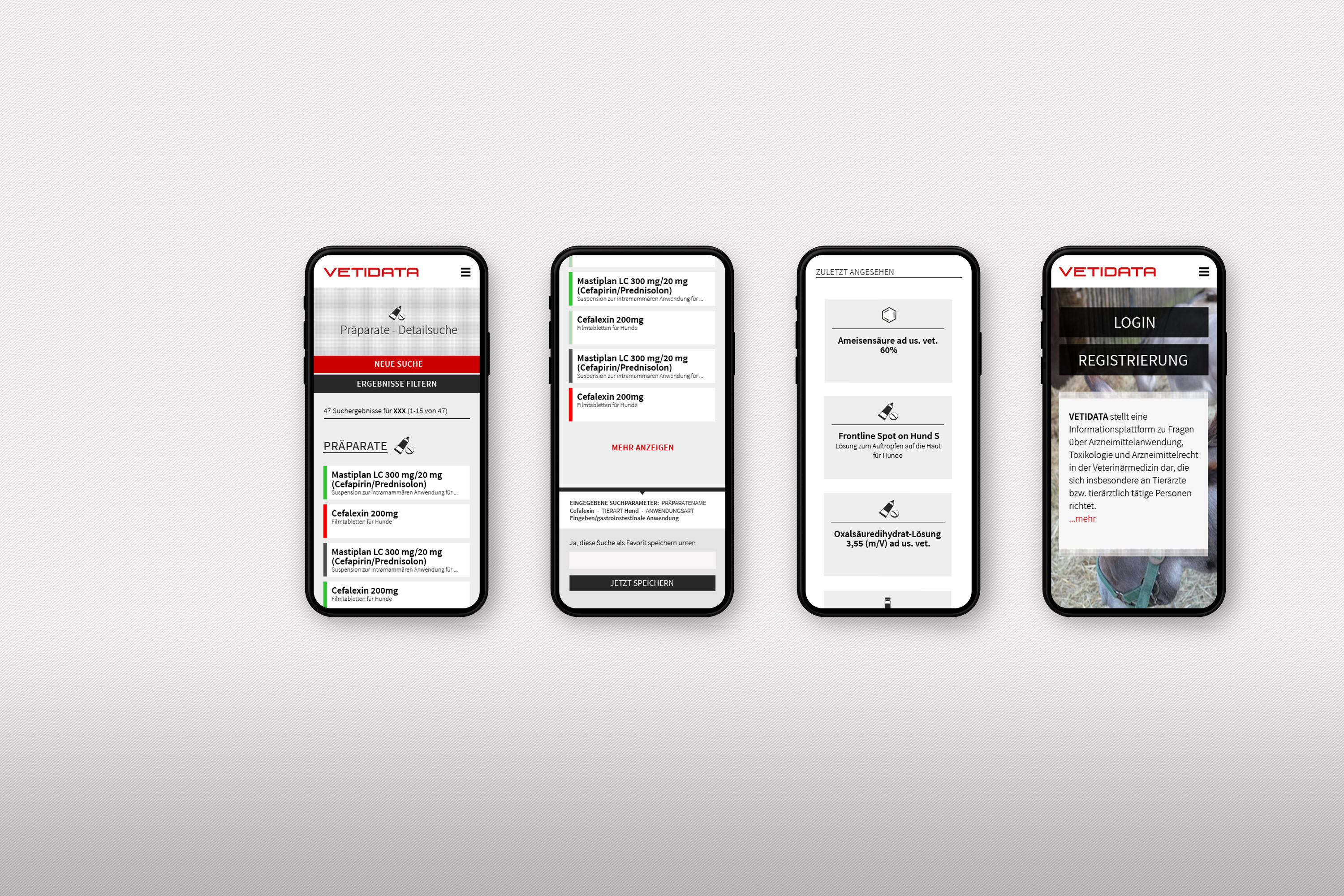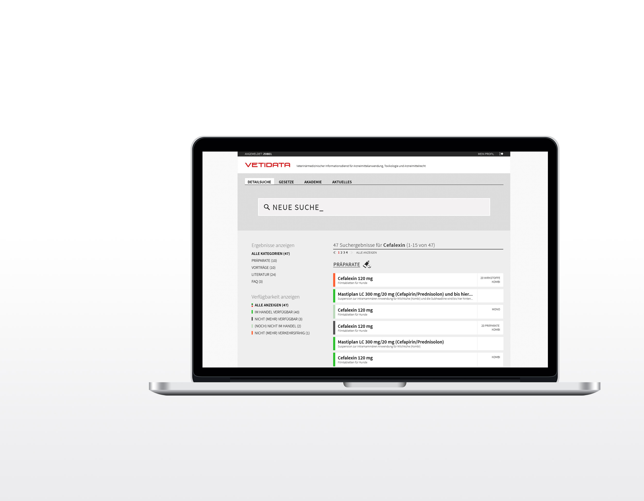 VETIDATA ist eine veterinärmedizinische Datenbank. Hier kann nach Medikamenten, deren Wirkverhalten, Anwendungen und gesetzlichen Grundlagen recherchiert werden. feineinstellung zeichnet sich gemeinsam mit Getamedia verantwortlich für den Relaunch der Website. Zielstellung ist die klare Nutzerführung für genauste Suchergebnisse. Sowohl bisherige als auch neue Nutzer sollen sich sicher zurecht finden. Eine zurückhaltende Typografie und kategorisierende Farbgestaltung halten ebenso Einzug, wie die Anwendung von Icons für wichtige Themengebiete sowie eine Startseite, die mit großflächigem Bildmaterial arbeitet.